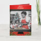Feiern Sie die Freude der Urlaubstraditionen mit dieser herzerwärmenden Weihnachtskarte, die eine Vintage Illustration einer Mutter und ihrer beiden Töchter enthält, die in einer gemütlichen Küche Kekse backen. Set gegen ein schneesicheres Fenster und einen glitzernden Weihnachtsbaum, die Szene fängt den Zauber der Familie, des Zusammenlebens und der süßen Momente ein, die während der schönsten Jahreszeit geteilt wurden. Die kräftigen roten Schürze Pop wunderschön vor dem Schwarz-Weiß-Hintergrund und schaffen ein nostalgisches und zeitloses Ambiente für die Ferienzeit.