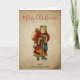 Eine Weihnachtskarte mit einem Vintagen Weihnachtsmann der Alten Welt. Klassische alte Welt santa, mit seinem berühmten roten Mantel und einer Tasche voller Spielzeuge. Dieser altmodische Weihnachtsmann ist schlank und hält einen Gehstock, um durch das Land zu reisen und allen Mädchen und Jungen Spielzeuge zu schenken. Alter Pergamentstil.