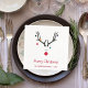 Ein lustiges, niedliches, modernes minimalistisches Bild eines Rentierkopfes mit roter Nase. Mit Weihnachtsschmuck, Bausteine hängen von den Antlers. Keine Hintergrundfarbe, Farben: weiß, rot, grau, blau, grün. Ein rotes, modernes handgeschriebenes Skript mit dem Text: Frohe Weihnachten. Vorlage für Ihren Familiennamen oder Text.