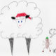 12x18 Landschaftsgrußkarte - Bah Humbug - Ein Schaf, das eine Weihnachtsmannmütze trägt und einen niedlichen kleinen Bug in einem grünen Bowler trägt, der eine Melodie summiert, auf witzige Weise einen Urlaubsgruß an den Empfänger schickt. Wünschen Sie jemanden glücklichen Urlaub mit ein wenig Ironie, um Ihren Punkt zu fahren. Original zeichn ist ein farbiger Bleistift auf Papier, der eingescannt und auf der Karte platziert wird.