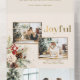 Feierlicher Urlaub Multi-Foto-Card-Design mit überlappenden Fotos, "Joyful" Gruß in Custom Gold Typografie, und farbenfrohe Ecke Bouquet von Winterkiefer, Rose und Heiligen mit goldenen Glitzern. Im Inneren finden Sie zusätzliche Textfelder und Bildvorlagen.
