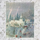 Vintage Illustration Weihnachtsfeiertag religiöses Design mit einer niedlichen Kapelle in der Wintersaison mit schneebedeckten Bäumen. Die Leute kommen in gezeichnet Pferdekutschen an, und Rauch steigt aus den Schornsteinen.