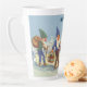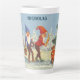 Leicht zu anpassen latte Tasse, fügen Sie einfach Ihren Namen! Vintage Abbildung Viktorianisch Frohe Weihnachtsbilder mit Elfen mit Bärten und spitzen Hüten im Schnee. Sie sehen aus wie Tomte, nisse oder Tomtenisse (Schweden) vor den Augen (Norwegen und Dänemark) oder Tonttu (Finnland), ein mythologisches Wesen aus skandinavischer Folklore. Die blaue Elf trägt einen Kranz, die grüne Elf trägt einen Sack voll Spielzeug und die rote Elf trägt eine beleuchtete Kerze. Sie sind im Winter in einem Wald und es gibt einen Teddybär unter einem Tannenbaum mit Kiefernzapfen und brennender Kerze.