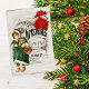 Vintages, kurzlebiges Design mit einer wunderschönen, Vintagen Weihnachtstypografie und einem jungen Mädchen, das im Winterschnee einen braunen Welpen trägt. Rote Chrysanthemum-Blume in der oberen rechten Ecke. Große dekorative Gaumendekoration für Wanddekoration oder antike Möbel.