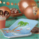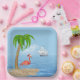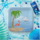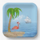 Rosa Flamingo mit Santa Cap und Weihnachtspalme in Strand Sand mit Boot und Ozean Wasser.