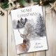 Ein majestätischer Buchhirsch blickt von einer schneebedeckten Berglandschaft auf die Vorderseite dieser Urlaubskarte. Die Aquarellbäume haben eine leichte Verschneidung. Der Text oben steht "MERRY CHRISTMAS", und unten rechts, in der Schrift, "aus Colorado. Im Inneren gibt es mehr Textfelder, die Sie anpassen können.