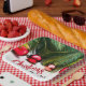 Bellen Sie sich zum Grill für ein Weihnachtsfest im Juli. Diese festlichen Teller sind bereit für Ihr jährliches Party im Hinterhof, mit tropischen Palmen und fröhlich roten Ornamenten für einen Urlaub Bash Sommerzeit Stil.