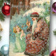 Braun rodelte alte Welt Vater Weihnachten sitzend in schneebedeckten Wäldern mit knienden Engel.