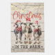 Genießen Sie dieses niedliche Bauernhaus "Weihnachten in der Scheune" Küchentuch mit roter und brauner Typografie, drei holsteinfarbene Kühe mit roten Weihnachtsmannmützen und Streichleuchten. Hintergrund aus hellem Holz. Eine wunderbare Ergänzung zu einem Bauernhaus oder einer Küche im Barockstil zu Weihnachten.
