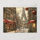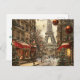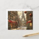 Feiern Sie die Saison mit der Postkarte "Festlicher Eiffelturm Boulevard". Dieses Design besticht durch eine schneebedeckte Straße, die mit Urlaubserscheinungen und dem strahlenden Eiffelturm geschmückt ist.