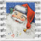 Vintage Illustration Frohe Weihnachtsbilder mit einem fröhlichen Weihnachtsmann mit einem großen Lächeln oder Grinsen. Er lacht, lacht und trägt eine Weihnachtsmannmütze mit ein paar heiligen Beeren und Beeren. Sein heller roter Hut hat am Ende eine Glocke, die Musik spielt und musikalische Noten schweben herum. Die Grüße der Jahreszeit und frohe Weihnachten!