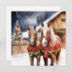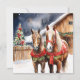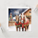 Hübsche festliche braune Pferde stehend vor einer alten rustikalen Scheune mit einem Weihnachtsbaum im Hintergrund. Fügen Sie Ihre individuelle Urlaubsnachricht und Familiennamen in den personalisierenden Bereich ein.