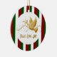 Eine festliche Xmas-Baum-Dekoration mit einem eleganten Goldvogel, der einen Olivenzweig im Mund trägt, umgeben von blumigen Wirbel und Streifen in Rot, Grün und Weiß. KÖNNEN SIE IT - Personalisieren Sie die Formulierung.