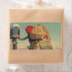 Vintage Illustration Frohe Weihnachtsbilder mit einem kleinen Jungen, der ein Paket mit Weihnachtsgeschenken und Geschenken aus dem Briefkasten durch den Schnee im Winter trägt. Der Junge trägt einen roten Hut und einen grünen Schal.