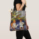 Schöne Tote-Taschen im Überdruck! Erhältlich in zwei Stilen und zwei Größen! Vintage Abbildung Viktorianisches Weihnachtsbild mit glücklichen Geschwistern auf einem Sofa. Ein Bruder und eine Schwester auf einem Sofa haben einen dekorierten Weihnachtsbaum und ein Fenster hinter ihnen. Das Mädchen liest ein Buch, und der Junge isst einen Bonbons. Im Text steht "Frohe Weihnachten".