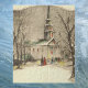 Vintage Illustration Viktorianischer Weihnachtsfeiertag religiöses Design mit einer Kirche in einer Winterlandschaft mit Bäumen. Es ist Schnee auf dem Boden, und die Parisher kommen für die Dienste an. Schöne antike Farbtöne mit kräftigen Rot- und Grüntönen in den Fenstern.