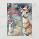 Diese Weihnachtspostkarte zeigt eine wunderbare Illustration von zwei Lahmen. Im Vordergrund steht das große Lama, das mit einer roten Weihnachtsmannmütze und einer Reihe farbenfroher Weihnachtsbeleuchtung geschmückt ist. Ein kleinerer Lama, der auch eine Weihnachtsmannmütze trägt, verleiht dem Hintergrund den Charme. Über den Lahmen steht der spielerische Text "Fleece Navidad!" in einem kursiven, roten Schriftart mit einer schneegrünen Kontur, die eine skurrile Touch hinzufügt. Der winterliche Hintergrund mit sanft abfallenden Schneeflocken und zusätzlichen Saiten mit beleuchteten Weihnachtsbeleuchtung verstärkt den Urlaubssinn. Der Text auf dieser Postkarte ist vollständig anpassbar, sodass Sie Ihre Nachricht individuell anpassen können, um Ihre Wünsche Anzug oder sie speziell an den Empfänger anzupassen. Diese einzigartige Mischung aus süße Tier-Anziehungskraft und festlichem Beifall macht es zu einer perfekten Wahl, um die Freude am Urlaub zu vermitteln.
