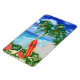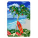 Herzlich willkommen an den warmen Sandstränden Ihres Lieblings-tropischen Inselstrands. Palmenbaum mit Weihnachtsschmuck und Lichtern, mit einem Retro-Surfbrett, das an den Weihnachtsbaum lehnt.