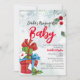 Weihnachten bringt uns eine Einladung zur Weihnachtsdusche. Aquarellgeschenke und Weihnachtsbaum mit Schneeflocken hinten.