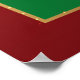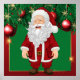 Illustration eines glücklichen Weihnachtsmannes, eines um die 70 Jahre alten weißen Mannes mit einem langen weißen Bart und einer roten Weihnachtsmannmütze, der einen roten Anzug mit weißem Trimm und einem schwarzen Gürtel trägt, der vor einem grünen Hintergrund stehend ist, mit Weihnachtsdekorationen, darunter Kiefernäste, Schneeflocken und rote Ziergegenstände, wird das Bild durch eine rote Grenze mit goldenen Akzenten gerahmt.