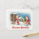 Zwei niedliche Kinder, die in Santa Claus-Outfits gekleidet sind und mit einem Hund im Schnee spielen, mit Geschenken, die verstreut sind. sgb01