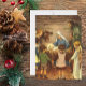 Vintage Darstellung religiöser Weihnachtsbilder mit einer wunderschönen klassischen Krippe-Familienszene mit Maria, Joseph und dem Säugling Jesus Christus in der Leitung in Bethlehem. Eine Christliche Religionsszene mit Kindern versammelte sich mit Händen um das Kind.