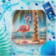 Ein festlicher Flamingo mit einer Weihnachtsmannmütze und Flip Flops steht an einem Sandstrand neben einer Palme, die in leuchtenden Lichtern umhüllt ist