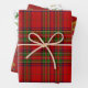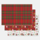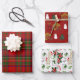 Hübsches Verpackungspapier mit 3 verschiedenen Mustern. Schneemänner sind auf rotem Blatt mit Lebkuchenhaus, Ziergegenständen und Weihnachtsbäumen, einem hübschen roten und grünen Tartan kariert und einem Teddybär und Poinsettia Blume auf Weiß.