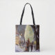 Schöne Tote-Taschen im Überdruck! Erhältlich in zwei Stilen und zwei Größen! Vintage Illustration Frohe Weihnachtsbilder mit einem Vater, der seine Kinder zum Shopping für Geschenke und Geschenke an Heiligabend holt. Auf dem Stadtplatz steht ein großer, weiß dekorierter Weihnachtsbaum. Ein Sohn wird durch den Schnee auf dem Bürgersteig in eine Schlitte gezogen.