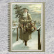 Vintage Illustration Weihnachtsfeierdesign mit einem Viktorianischen Weihnachtsmann, der durch den Schnee verlassend Fußspuren geht. Er trägt einen Weihnachtsbaum und einen Körbchen Spielzeug auf einem bewölkten Abend, wobei der Mond durch die Wolken strahlt. Ursprünglich eine skandinavische Postkarte mit dem Text: Gott Jul oder Frohe Weihnachten.