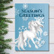 Die Weihnachtsgrüße dieser Saison bietet ein schönes, weißes Pferd mit fließender Mane und Schwanz mit weißem und blauen Schneeflocken. Innen Gruß - "Wir wünschen Ihnen eine schöne Urlaubssaison voller Freude und Lachen!" - Der Gruß kann personalisiert zu lesen sein, wie Sie möchten.