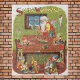 Vintage Illustration Frohe Weihnachtsfeiergestaltung mit einem fröhlichen Weihnachtsmann und seinen Elfen viel beschäftigte Gebäude Spielzeuge in Santa's Werkstatt am Nordpol an Heiligabend. Jeder Elf hat ein Lieblingsspielzeug. Das Bild stammt aus einem antiken Adventskalender. Grüße und glückliche Ferien der Saison!