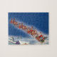 Vintage Illustration Frohe Weihnachtsbilder mit einem fröhlichen Weihnachtsmann mit seinem Rentier. Sie fliegen seinen Schlitten voll von Spielzeug durch den blauen Himmel und über eine schneebedeckte schlafende Stadt am Heiligabend im Winter. Ho, ho, ho Happy Holidays and Season's Greetings!