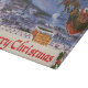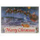 Vintage Illustration Weihnachtsfeierdesign mit dem Weihnachtsmann, dessen Rentier seinen Schlitten fliegen und an Heiligabend Spielzeug liefern. Der Weihnachtsmann fliegt über Dächer mit Schornsteinen des Schlafortes an dieser klaren, schönen Nacht mit leuchtend leuchtenden Sternen. Text liest frohe Weihnachten.