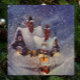 Vintage Illustration Frohe Weihnachtsbilder mit der Werkstatt des Weihnachtsmanns am Nordpol während eines Schneesturms am Heiligen Abend. Das Haus hat zwei Schornsteine, um warm behalten und im Winterschnee zu schnupfen. Alle Lichter sind an und Schneeflocken fallen in dieser kühlen Winternacht.
