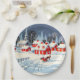 Hübsche Winterlandschaft mit roten Häusern und schneebedeckten Bäumen. Ein gezeichnet Schlitten gleitet auf dem Weg zur Kirche auf einer Landstraße.