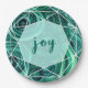Dieser moderne Feiertagspapier-Teller sagt "Freude" in der grünen Typografie, mit einem grünen Malachitentwurf und einer weißen geometrischen Überlagerung. Wir haben Kunst von LABFcreations verwendet.