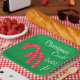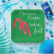 Weihnachts Cookie Baking Spaß geschrieben in weißer Schrift. Zwei rote und weiße gestreifte Süßspeisen. Festlicher grüner Hintergrund. Original Artwork © TamiraZDesign.
