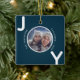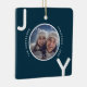 Moderne, minimalistische Weihnachtsschmuck in Blau und Weiß. Ein klassisch blauer Hintergrund mit dem Wort JOY mit weißen, fett geschriebenen Buchstaben. Der Buchstabe O wird als Foto verwendet. Personalisieren und fügen Sie Ihr eigenes Foto, Name und Jahr.