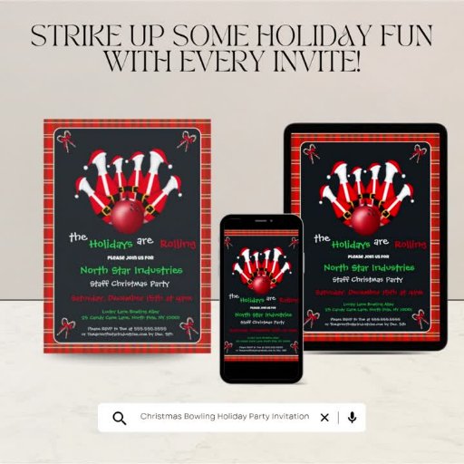 Diese festliche Weihnachts-Bowling-Party-Einladung zeigt Santa-motivierte Bowling-Pins und einen leuchtend roten Weihnachts-Bowlingball vor einem fröhlichen Weihnachts-Karomuster-Hintergrund - das perfekte Design, um saisonale Freude und Party-Stimmung zu verbreiten.