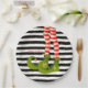 Auf einem schwarz-weiß gestreiften Hintergrund mit grünen Stiefelbeinen wird Ihr Weihnachtsgrüßen in schicker Schrift auf diesen niedlichen Tellern aus Urlaubspapieren dargestellt. PASSENDE Artikel in unserem Geschäft.
