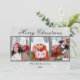 Eine Weihnachtskarte, fügen Sie 3 eigene Fotos hinzu. Ein Imitat silber metallisch aussehender Hintergrund und funkelnde Imitate Glitzer. Mit dem Text: Frohe Weihnachten geschrieben mit einem handgeschriebenen Stil Skript. Personalisieren und fügen Sie Ihren Familiennamen und das Jahr hinzu.