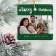 Weißer Text: Frohe Weihnachten, geschrieben mit einem trendigen Stil Skript. Personalisieren und verwenden Sie Ihr eigenes Foto und Ihre eigenen Namen. Ein klassischer grüner Hintergrund.