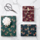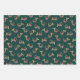 Dieses Set aus Packpapier-Blätter zeigt ein goldenes Weihnachtshörnchen mit Kiefernästen und verschiedenen Grünpflanzen und Beeren, mit innen gekrackten Kardinälen und weiteren Kiefern, Kiefernzapfen und heiligen Blätter im Hintergrund. Die drei Blätter sind in drei verschiedenen Farben für den Hintergrund gehalten.