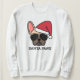 Mit diesem niedlichen Weihnachtspullover machen Sie Spaß. Das Design ist mit einem hellbraunen französischen Bulldoggen mit roter Weihnachtsmannmütze und einer Sonnenbrille mit dem Aufdruck "Santa Paws" ausgestattet.