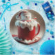 Ein großes Marshmallow, das als Schneemann mit Weihnachtsmannmütze entworfen wurde, sitzt auf einer roten Tasse, die mit cremigem Schaum gefüllt ist