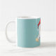 Eine Kaffee-Tasse mit einer Illustration eines niedlichen kleinen Weihnachtsschneemonsters, Spielzeug-Puppe, die eine rote Weihnachtsmannmütze trägt. Die kleine Schneekreatur hat eine Pull-Kette, um ihn reden zu lassen, und er ist mit weichem, weißem Fell mit hellbraunen Akzenten bedeckt. Hintergrund ist eine Retro-grüne Farbe.