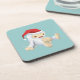Ein Set aus Plastik-Untersetzer mit einer Illustration eines niedlichen kleinen weißen Weihnachtsschneemonsters, Spielzeug-Puppe, mit einer roten Weihnachtsmannmütze. Das kleine weiße Schneegestein hat eine Zugseile, um ihn zum Reden zu bringen, und er ist mit weich weißem Fell mit hellbraunen Akzenten bedeckt. Hintergrund ist eine Retro-grüne Farbe.