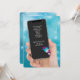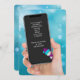 Weihnachts-Party laden Textnachrichten auf Handy mit niedlichem Schneemann. Türkisblaue, abstrakte Beleuchtung für den festlichen Hintergrund.