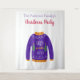 Ein Wandteppich für eine lustige Urlaubssaison und Weihnachten Party, Abendessen. Ein schick weißer Hintergrund. Die Dekoration ist mit einem üppig blauen, weißen, orangefarbenen und grünen Weihnachtspulli verziert. Personalisieren und fügen Sie Ihren Familiennamen, blaue Buchstaben. Der Text: Weihnachts-Party ist rot geschrieben mit einem modernen handgeschriebenen Schriftsatz. Kann als Begrüßungsschild, Party-Wanddekoration oder als Foto-Standfläche verwendet werden.